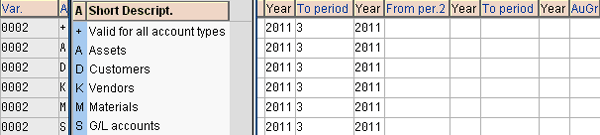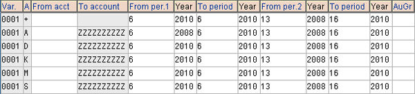 В первом столбце "Var." (вариант периода проводки) указывается балансовая единица или группа балансовых единиц. В качестве предпосылки для любой финансовой проводки необходимо указать по крайней мере одну балансовую единицу или группу балансовых единиц. В этом ряду в столбце A должен присутствовать знак + (обозначающий все типы счетов).