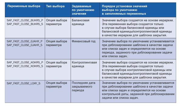 При создании шаблона закрытия в системе генерируются различные переменные с параметрами. Их можно использовать в варианте для установки значений параметров по умолчанию (в отчете или программе), присвоенных в пульте управления закрытием SAP Financial. В пульте управления закрытием SAP Financial предварительно определены переменные выбора, представленные в Табл. 1.