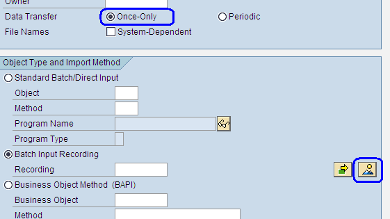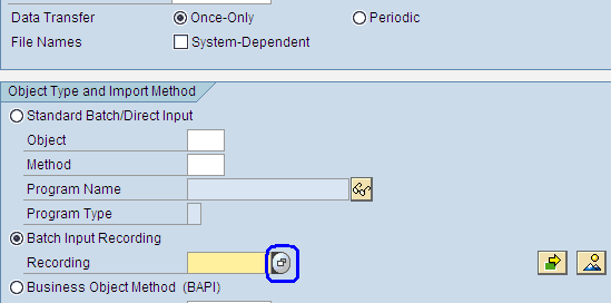 Выберем значение «Once-only» для Data Transfer и в области «Object Type and Import Method» укажем «Batch Input Recording» и затем нажмём кнопку «Overview» (пиктограмма