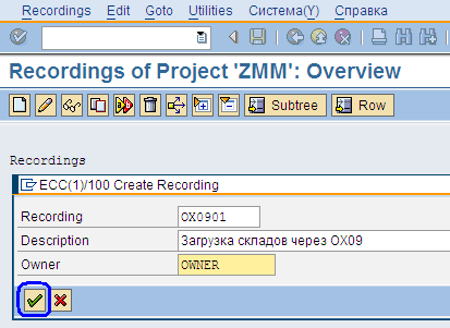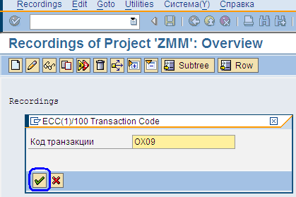 В следующем окне (Рис.11) система запросит код транзакции, укажем – OX09, так как основные данные склада ведутся в транзакции OX09. Затем нажимаем «Зеленую галочку», пиктограмма