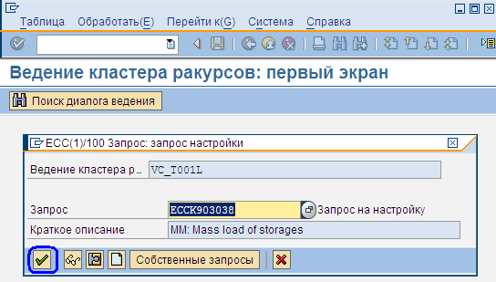 , и указываем номер запроса или создаём новый. После указания номера транспортного запроса настройки нажимаем «Зеленую галочку», пиктограмма