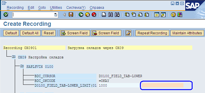 Для данного решения мы зададим способ загрузки посредством записи («Batch Input Recording»). Этот способ позволяет последовательно записать действия пользователя, а затем повторить эти действия, но уже с другими значениями. Создание атрибутов в пункте «Maintain Object Attributes» является первым шагом в создании пакетного ввода.