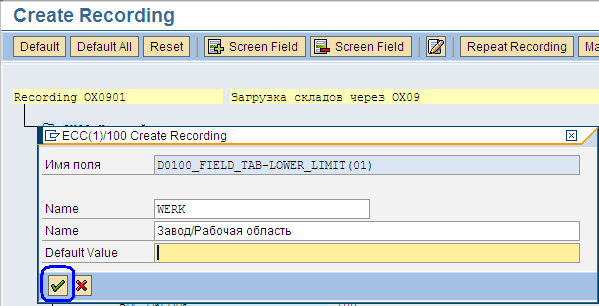 В окне «Create Recording» транзакции LSMW (Рис.22) нам необходимо задать имена полям, в которые мы вводили данные.