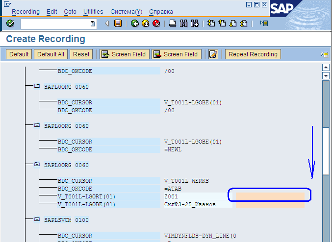 В результате наших действий экран «Recording» транзакции LSMW будет выглядеть приблизительно так (Рис.25, показана часть)
