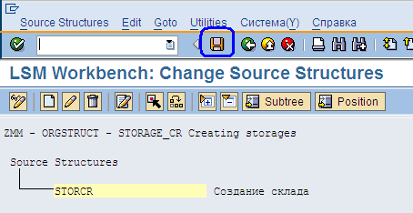 После заполнения параметров склада, его наименования и подробных адресных данных нам необходимо сохранить все введённые данные и положить их в транспортный запрос для переноса в тестовую, а затем в продуктивную систему. Для этого нажимаем на кнопку «Сохранить» (Рис.21), пиктограмма