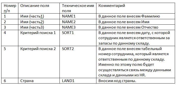 Для выполнения этого условия основные данные каждого склада должны содержать табельный номер сотрудника – материально ответственного лица. Табельный номер предполагается вносить в поле «критерий поиска 2» в адресных данных склада с обозначенным номером склада. Количество складов, которые должны быть созданы для материально ответственных лиц, превышает 500.
