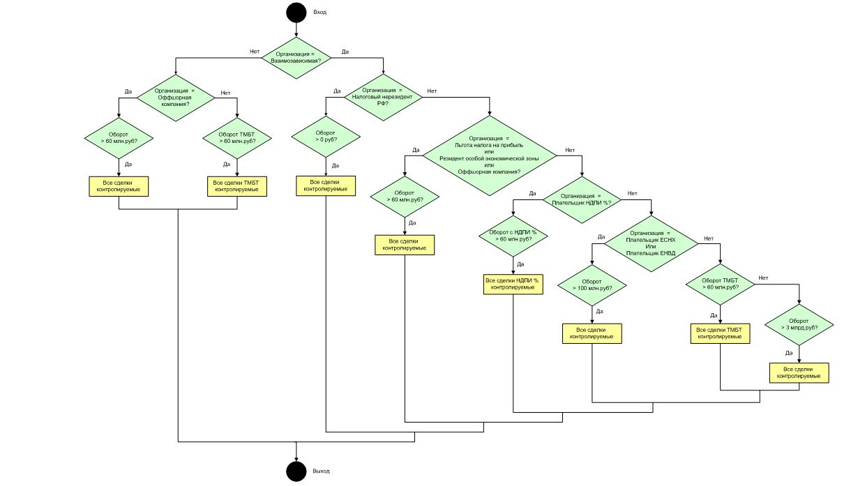 Выбор сделок, попадающих под законодательство ТЦО (далее контролируемые сделки), выполняется в разрезе взаимозависимых с налогоплательщиком организаций. В отдельных случаях контролируемыми являются также сделки с организациями, не удовлетворяющими критериям взаимозависимости. Блок-схема алгоритма выявления контролируемых сделок приведена на Рис.1.2.