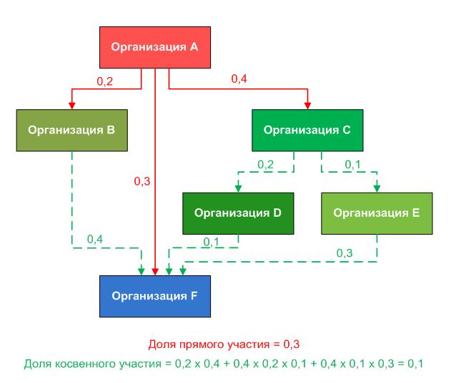 Рис.1.1. Пример расчета долей прямого и косвенного участия организации A в организации F