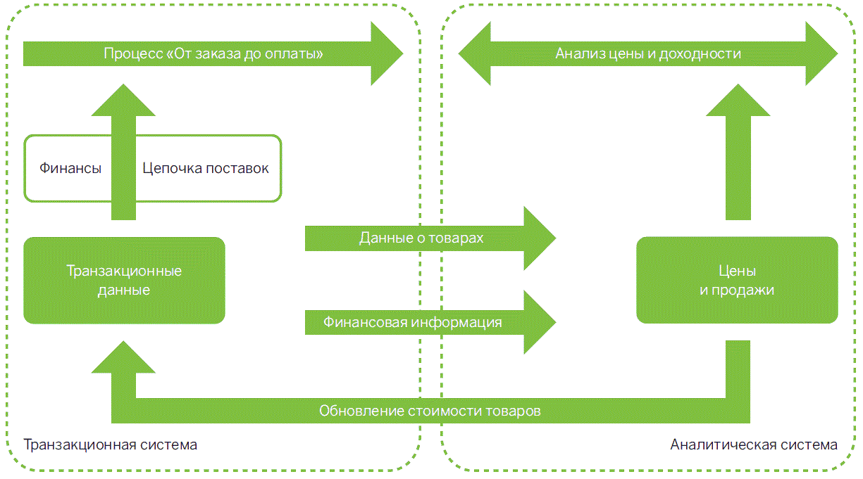 Транзакционная: «order to cash» является сквозным бизнес процессом. Его действие затрагивает многие отделы предприятия и требует данных из большого количества систем. В нашем случае данные о товарах и финансовые данные получаются из транзакционной системы. В нашем случае предполагается, что транзакционные данные используются в финансовой системе и в системе поставок. Компании могут создавать миллионы или даже миллиарды документов в день. Таким образом, автоматизированные системы должны иметь возможность обрабатывать и сохранять эти документы очень быстро. Каждый документ может быть достаточно простым по объему данных, которые в нем содержаться, но потенциально может потребоваться большому количеству людей или систем. При этом целостность данных является критичной, и эффективность работы процесса может играть важную роль в успешности жизнедеятельности предприятия.