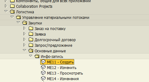 Ведение инфо-записи материала осуществляется с помощью транзакций ME11/ME12/ME13.