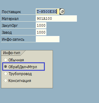 Для использования инфо-записи в давальческих операциях необходимо отметить Инфо-тип "Обработка давальческого материала", а также, как и для обычной инфо-записи, указать поставщика, материал, завод и закупочную организацию (см. Рис.3).