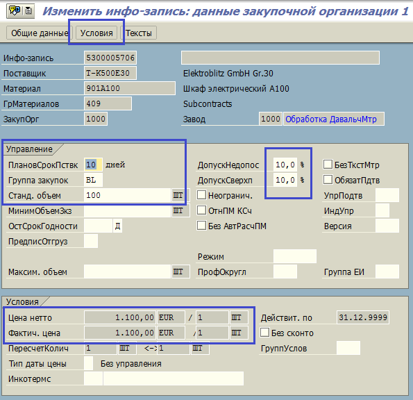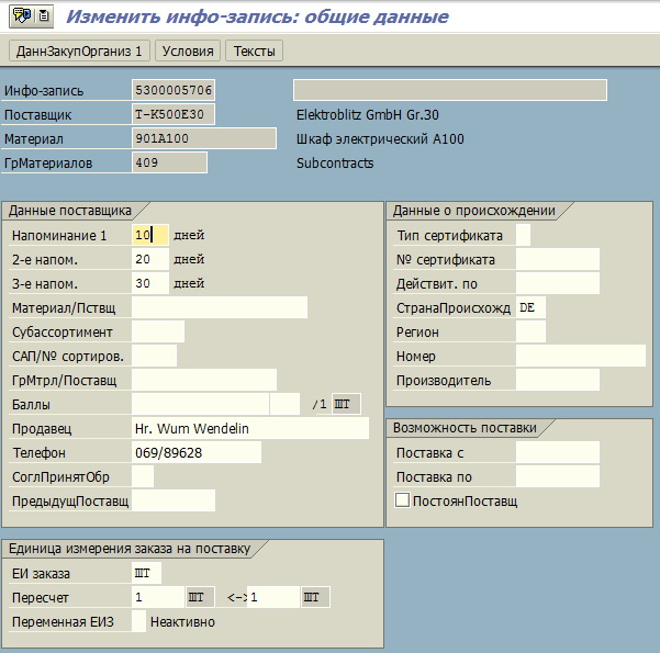 Инфо-запись содержит условия, даты, контакты и другую информацию, на которых конкретный поставщик предоставляет конкретный материал. В моем случае на Рис.3 представлена инфо-запись материала 901A100 по поставщику T-K500E30.