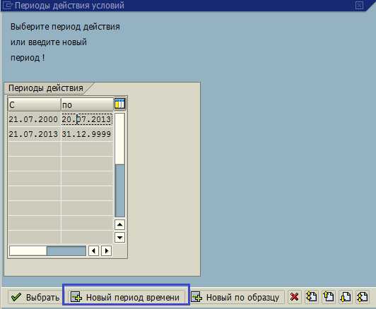 Необходимо иметь ввиду, что в системе нельзя создать две инфо-записи на одного и того же поставщика и на один и тот же материал, однако условия инфо-записи можно разграничить во времени. Это делается с помощью ввода нового периода времени под кнопкой "Условия" (Рис.5 и 6).