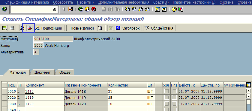 Рис. 8 Экран "Обзор позиций" в спецификации материала