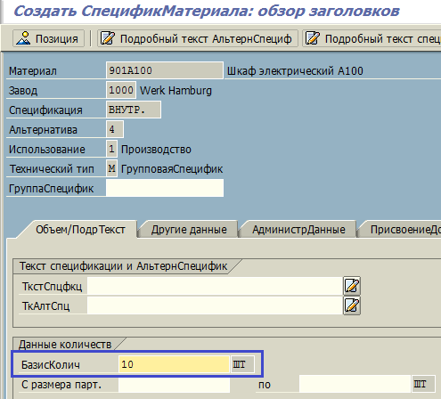 Рис. 9 Указание базисного количества материала на экране заголовка спецификации