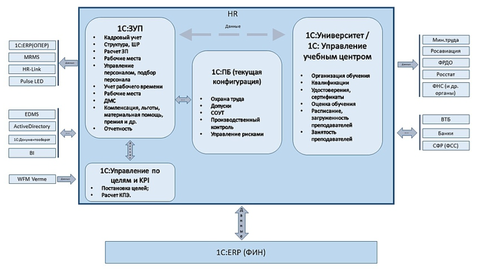 Новое решения для управления персоналом будет интегрироваться с множеством других систем, уже работающих в «Пулково», а также внешних. Помимо других решений «1С» в их числе: ActiveDirectory (управление учетными записями пользователями), FriendWork, HRLink (кадровый электронный документооборот), MRMS (управление мобильными ресурсами аэропорта), Start-Link (модуль приёма кандидатов), BI, банковские системы, системы Росавиации, ФНС и проч.