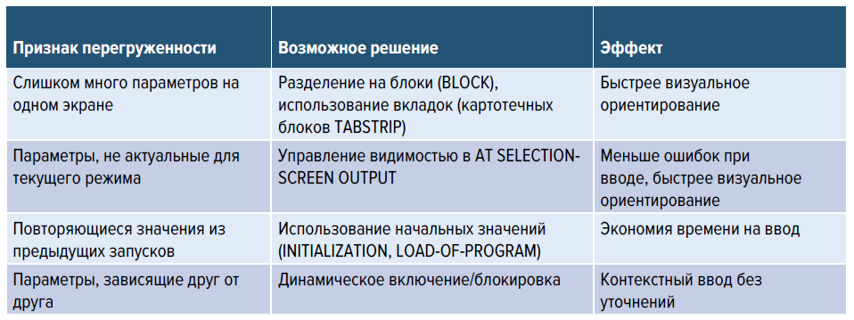 Дело в том, что большинство селекционных экранов создаются как статичные формы. Все поля видны сразу, независимо от ситуации. Проверки выполняются после нажатия кнопки «Выполнить» (Execute), то есть уже после того, как пользователь ошибся. Программа выполняет задачу, но не очень сильно помогает вводить данные правильно (даже если используются стандартные механизмы выбора допустимых значений).