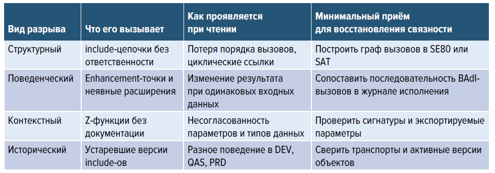 Подобные случаи не редкость. ABAP даёт гибкость, но она обращается против читателя, если структура не зафиксирована. Чтобы отделить архитектурные особенности от хаотичных фрагментов, удобно держать перед глазами классификацию типичных разрывов (см. Табл. 1).