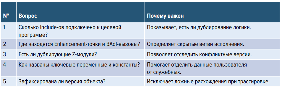 Основная трудность чтения — распределённость логики. Физически код разбросан между объектами, но логически они связаны. Include может быть подключён в нескольких местах, при этом порядок вызовов меняется в зависимости от условий исполнения. Enhancement-точки могут добавлять обработчики, которых не видно в исходной программе, но они меняют результат. Z-расширения иногда перехватывают поток данных раньше, чем основная процедура. В одном из проектов специалист FI заметил: программа расчёта налогов вызывала одну и ту же форму из разных include-ов, но с разными параметрами. Ошибка проявлялась не в логике, а в последовательности подключений; только трассировка показала, что точка входа срабатывает трижды. Так выяснилось: код был корректен, но архитектура — рассинхронизирована.