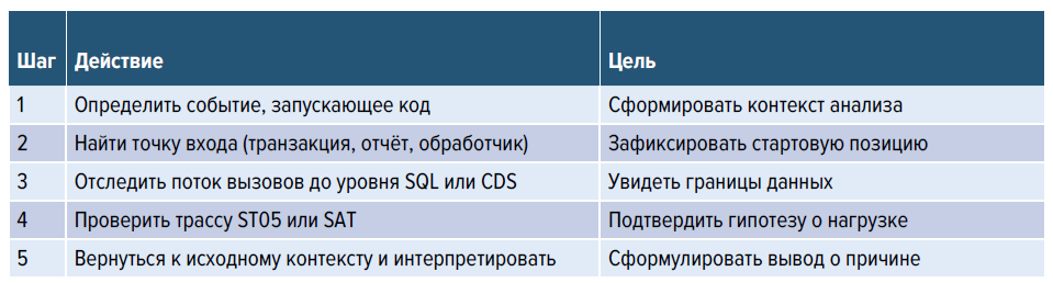 Иногда эффективнее идти обратным маршрутом — от результата к причине. Если, например, отчёт возвращает неверное количество записей, поиск можно начать с анализа SQL-трассы: какой запрос реально выполнялся, какие таблицы были задействованы, какие фильтры применялись. Такой подход уменьшает шум, потому что читатель работает с фактами исполнения, а не с предположениями о структуре программы.