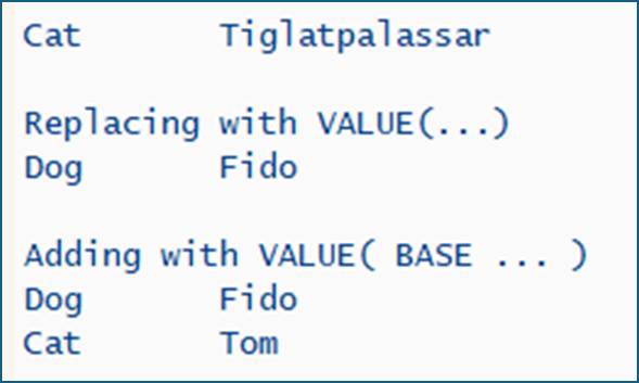 types : begin of ts_pet , species type char10 , name type char20 , end of ts_pet , tt type standard table of ts_pet with default key. data gt type standard table of ts_pet. start-of-selection. gt = VALUE #( ( species = 'Cat' name = 'Tiglatpalassar' ) ). loop at gt into data(pet). write / pet. endloop. skip. write: / 'Replacing with VALUE(...)'. gt = VALUE #( ( species = 'Dog' name = 'Fido' ) ). loop at gt into pet. write / pet. endloop. skip. write: / 'Adding with VALUE( BASE ... )'. gt = VALUE #( BASE gt ( species = 'Cat' name = 'Tom' ) ). loop at gt into pet. write / pet. endloop.