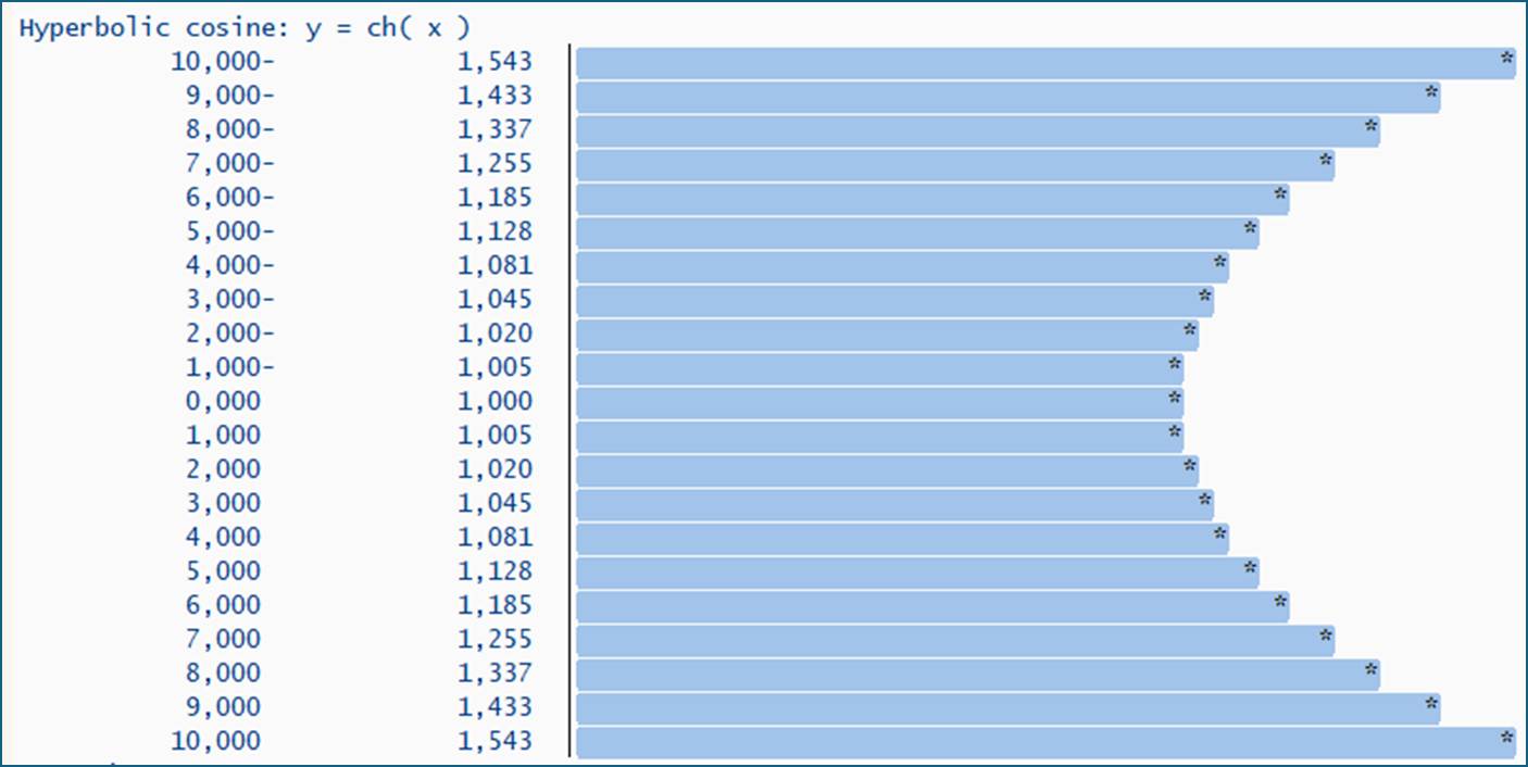 types : begin of ts , xx type p decimals 3 , ff type p decimals 3 , gg type string , end of ts , tt type standard table of ts with empty key. start-of-selection. data(gt) = value tt( FOR i = -10 THEN i + 1 WHILE i <= 10 ( xx = i ff = ( exp( i / 10 ) + exp( - i / 10 ) ) / 2 gg = `|` && repeat( val = ` ` occ = ( exp( i / 10 ) + exp( - i / 10 ) ) * 20 - 1 ) && `*` ) ). write: / 'Hyperbolic cosine: y = ch( x )'. loop at gt into data(gs). write: / gs-xx, gs-ff, gs-gg color col_key. endloop.