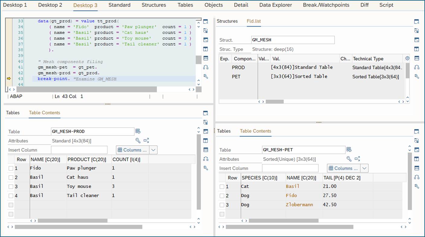 types: begin of ts_pet , species type char10 , name type char20 , tail type p length 4 decimals 2 , end of ts_pet , begin of ts_prod , name type char20 , product type char20 , count type i , end of ts_prod , tt_pet type sorted table of ts_pet with unique key name , tt_prod type standard table of ts_prod with empty key . types: begin of MESH tm_mesh , prod type tt_prod ASSOCIATION prod_to_pet to pet on name = name , pet type tt_pet , end of MESH tm_mesh. data gm_mesh type tm_mesh. start-of-selection. " Tables filling data(gt_pet) = value tt_pet( ( species = 'Dog' tail = '27.5' name = 'Fido' ) ( species = 'Dog' tail = '42.5' name = 'Zlobermann' ) ( species = 'Cat' tail = 21 name = 'Basil' ) ). data(gt_prod) = value tt_prod( ( name = 'Fido' product = 'Paw plunger' count = 1 ) ( name = 'Basil' product = 'Cat haus' count = 1 ) ( name = 'Basil' product = 'Toy mouse' count = 3 ) ( name = 'Basil' product = 'Tail cleaner' count = 1 ) ). " Mesh components filing gm_mesh-pet = gt_pet. gm_mesh-prod = gt_prod. break-point. "Examine GM_MESH " Mesh components display loop at gm_mesh-prod into data(gs_prod). write: / gs_prod-name, gs_prod-product, gs_prod-count. endloop. skip. loop at gm_mesh-pet into data(gs_pet). write: / gs_pet-name, gs_pet-species, gs_pet-tail. endloop. skip. " Loop at Mesh loop at gm_mesh-prod into gs_prod. data(pet_detl) * = gm_mesh-prod\prod_to_pet[ gm_mesh-prod[ name = gs_prod-name ] ]. = gm_mesh-prod\prod_to_pet[ gs_prod ]. write: / gs_prod-name, gs_prod-product, gs_prod-count , pet_detl-species, pet_detl-tail. endloop.