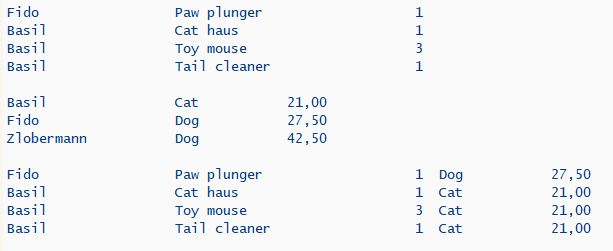 Чтобы показать, как это делается, сделаем мэш из двух таблиц. В одной будут собаки и кошки с длинами их хвостов, а в другой продукты обихода для их жизни дома. Устроим мэш с ассоциацией по имени животного (Лист. 24, состав мэша и его конмпонентов — Рис. 21, результат — Рис. 22).