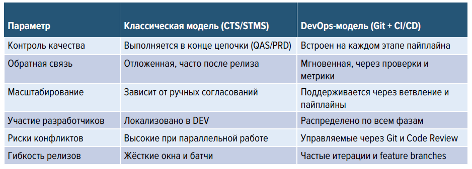 Табл. 1. Сравнение транспортной и DevOps-модели поставки изменений в SAP