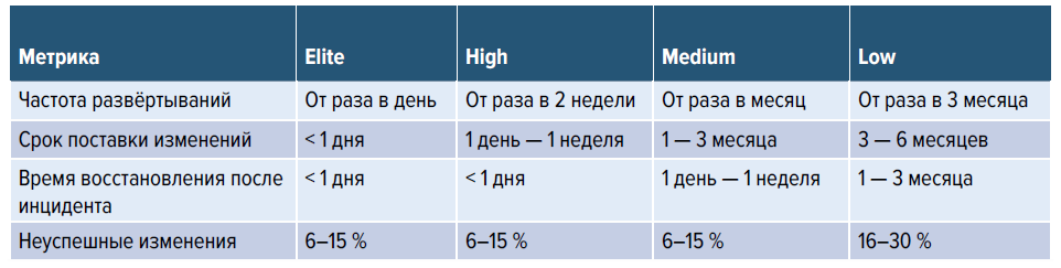 Табл. 2. Медианные значения основных метрик DevOps-профилей (по данным State of DevOps Russia 2024, стр. 45)