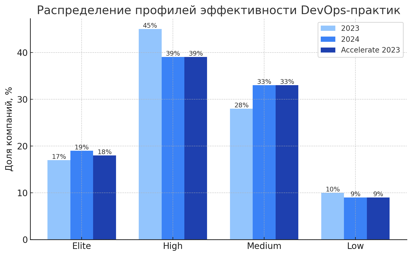Российская индустрия DevOps вышла из фазы энтузиазма и перешла к состоянию неравномерной зрелости. По данным State of DevOps Russia 2024, распределение компаний по профилям эффективности выглядит следующим образом: Elite — 19 %, High — 39 %, Medium — 33 %, Low — 9 % (см. Рис. 1). Эти категории формируются не по самооценке, а по четырём метрикам эффективности — частоте развёртываний, сроку поставки, времени восстановления и доле неуспешных изменений. Именно сочетание этих показателей позволяет судить о реальной устойчивости процессов, а не об уровне заявленных практик.