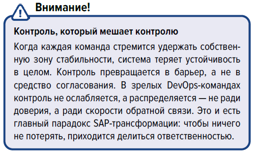 Так возникает типичная особенность зрелости SAP-проектов: чем совершеннее инструменты контроля, тем выше риск, что ими будут пользоваться выборочно. DevOps в SAP, в отличие от opensource-проектов, строится не на доверии, а на регламенте, и именно поэтому подлинная зрелость начинается там, где автоматизация проверок становится не требованием, а частью профессиональной привычки. Специфика SAP не в том, что DevOps здесь сложнее, а в том, что он начинается с архитектуры — а не с инструментов.