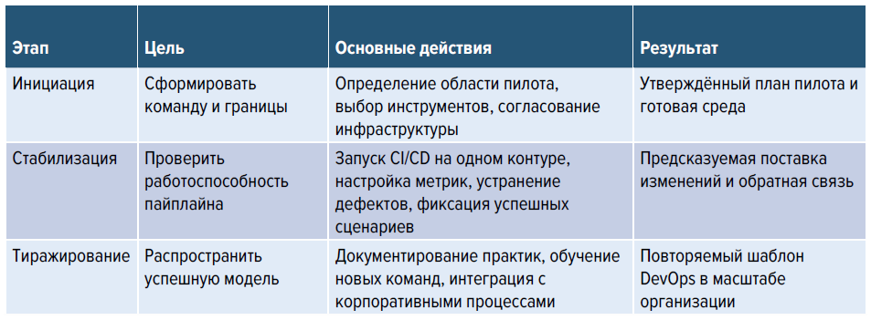 Чтобы сделать пилот управляемым, полезно рассматривать его как трёхфазный цикл: инициация, стабилизация, тиражирование (см. табл. 3). Эти этапы показывают, как эксперимент становится повторяемым процессом, а процесс — архитектурным шаблоном.