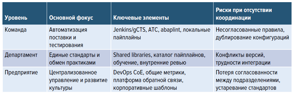 В логике зрелости масштабирование проходит три уровня — командный, департаментский и корпоративный. Каждый уровень добавляет новые функции: от локальной автоматизации до управления культурой разработки. Это представлено в Табл. 4.