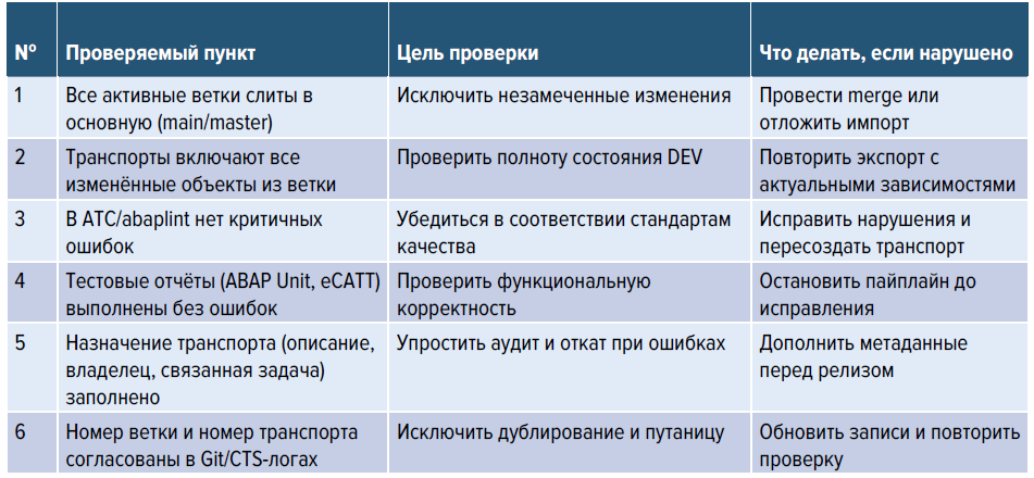 Типовая мера — использовать автоматическую проверку «consistency check» в CI-пайплайне: если ветка слита, но соответствующий транспорт не содержит последних объектов, пайплайн должен блокировать продвижение на следующий этап. Это несложная проверка, но она резко снижает количество инцидентов, связанных с несогласованными релизами.
