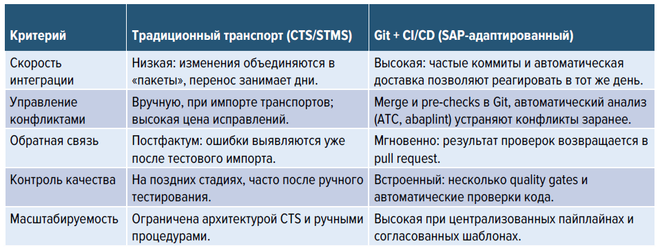В транспортной модели главный аргумент — безопасность. Каждое изменение проходит полный цикл согласований, что снижает риск несанкционированных релизов. Однако этот подход плохо справляется с динамикой современной разработки: пока транспорт дойдет до QAS, требования могут устареть. Git и CI/CD, напротив, создают ощущение живого процесса — изменения проходят весь путь от коммита до релиза за часы, а не недели. Здесь выигрывает не только скорость, но и понимание причин ошибок: система показывает, где и почему код не прошёл проверку.