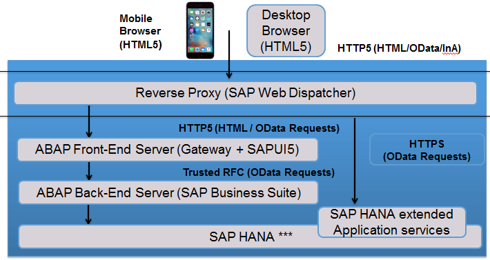 Приложение SAP Fiori работает на базе стандартных протоколов: OData и SAPUI5. OData — это протокол открытого стандарта для обмена (запроса и обновления) данных через сеть по стандартным проколам (HTTP, XML или Simple Object Access Protocol [SOAP]). Он предоставляет веб-интерфейс прикладного программирования (API), который полностью соответствует принципам проектирования Representational State Transfer (REST). Информацию приложения можно извлечь через JavaScript Object Notation (JSON) или XML.