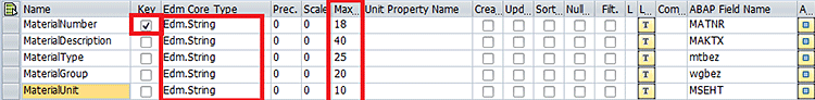 Необходимо предоставить информацию мэппинга из свойства SAPUI5 с внутренними типами и полями данных SAP (Табл. 1). Ключом для этой сущности является номер материала. Проверьте, что все эти записи имеют тип Edm.String, который представляет собой обязательный префикс согласно определению Odata.org.