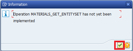 Это всплывающее окно уведомляет пользователя о том, что операция MATERIALS_GET_ENTITYSET еще не реализована. Для каждого типа сущности модели OData создается несколько методов. Метод GetEntitySet представляет собой автоматически создаваемый метод запроса для получения набора материалов. Выберите пиктограмму с зеленой галочкой (рис. 12). Появится папка «Унаследованные методы», см. Рис. 13.