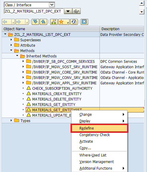 Теперь выберите и переопределите унаследованный метод MATERIALS_GET_ENTITYSET. Для этого щелкните правой кнопкой мыши по имени метода (MATERIALS_GET_ENTITYSET) и выберите опцию «Переопределить». Метод MATERIALS_GET_ENTITYSET является методом запроса для извлечения набора материалов (требуется для создания списка материалов). После переопределения методы сохраняются автоматически.