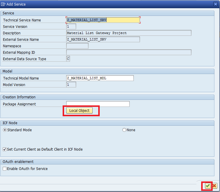 Во всплывающем окне «Добавление сервиса» пользователь может выбрать опцию «Локальный объект», а также просмотреть подробные данные сервиса, модели, информацию о создании, подробные данные узла ICF и активации OAuth. Введите подробные данные сервиса по вашему проекту и нажмите кнопку «Локальный объект». Для продолжения и завершения процесса регистрации щелкните по пиктограмме с зеленой галочкой.