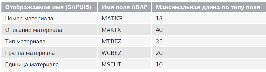В табл. 1 отображаются критерии данных свойств/полей для отображаемого имени (SAPUI5), имени поля ABAP и максимальной длины по типу поля. Базовые типы OData определяют, какой тип модели данных объекта (EDM) разрешен в OData для данного свойства во время выполнения. Организация OData определяет типы так называемых простых данных. Каждый член этой организации применяет при обмене данными обязательные стандарты. Определение приводится по ссылке http://www.odata.org/documentation/odata-version-2-0/overview/.