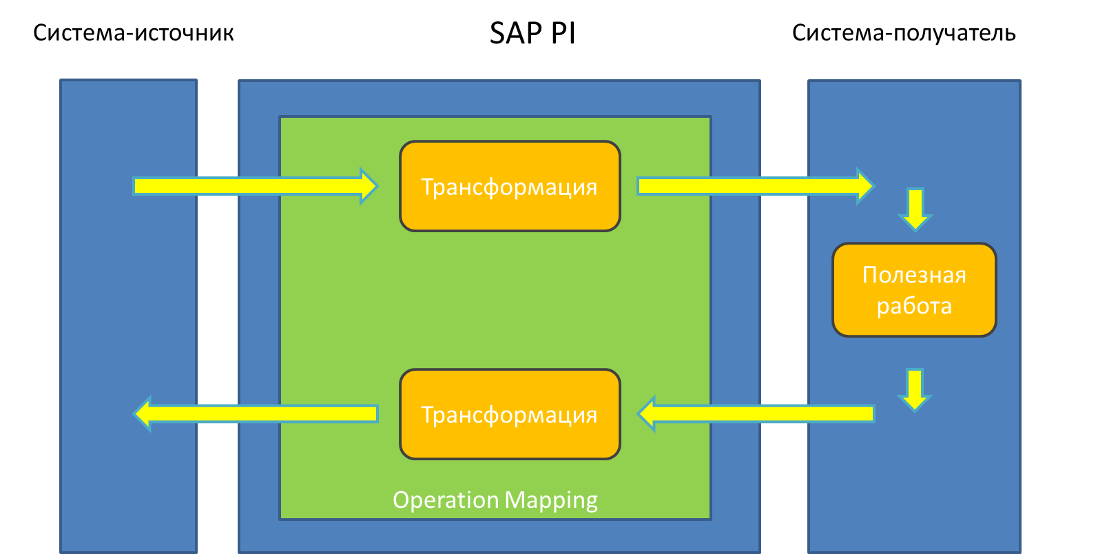Подавляющее большинство интеграционных сценариев, в которых применяется интеграционная шина SAP PI, протекают следующим образом. Система-источник выполняет запрос, SAP PI осуществляет преобразование данных запроса, система-получатель выполняет обработку запроса и формирует ответное сообщение, SAP PI выполняет преобразование данных ответа и возвращает его системе-отправителю (рис. 1).