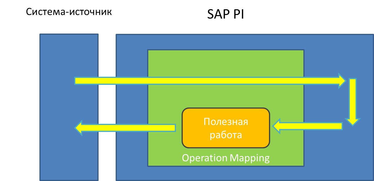 Однако существуют ситуации, в которых сценарий интеграции отходит от описанной выше схемы. Примером такой ситуации является обработка запроса исключительно с помощью SAP PI (т.е. преобразования и данных запроса, и самого запроса), ввиду отсутствия системы-получателя данных (рис. 2).