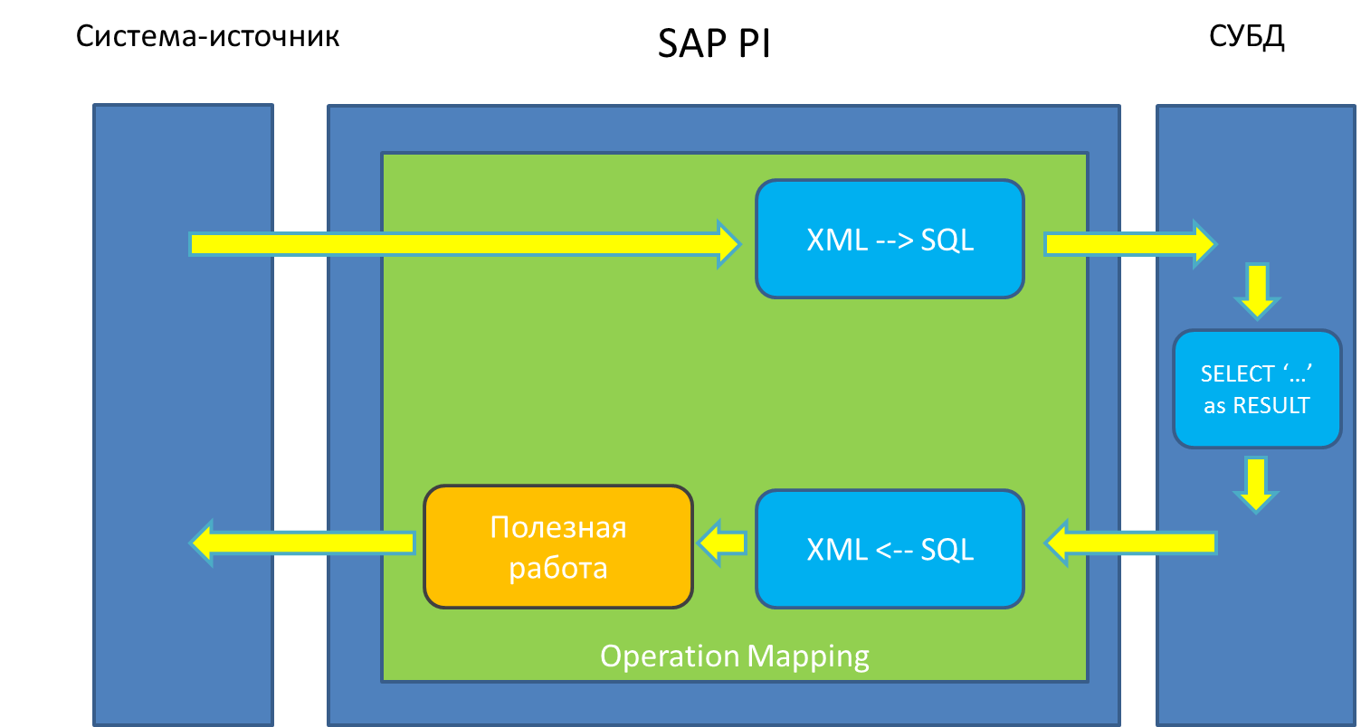 В свою очередь SAP PI выполняет преобразование XML-сообщения в SQL-запрос и последующее преобразование SQL-ответа обратно в XML-сообщение без потери полезной нагрузки (рис. 3).