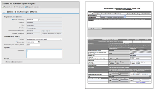 Processes and Forms - это технология, направленная на автоматизацию бизнес процессов по изменению основных данных в HR. Processes and Forms уже входит в основной модуль EA-HR, дополнительной установки не требуется. Начиная с EHP2, шаблоны для согласования были основаны на интерактивных PDF формах, что негативно сказывалось на производительности и удобстве использования. Сейчас, с выходом EHP7, появилась возможность создавать формуляры в формате FPM, так как FPM реализуется с помощью Web Dynpro, пользовательский интерфейс полностью преобразился, стало более удобно использовать и быстрее разрабатывать сами формы. На рис. 1 показаны примеры форм.