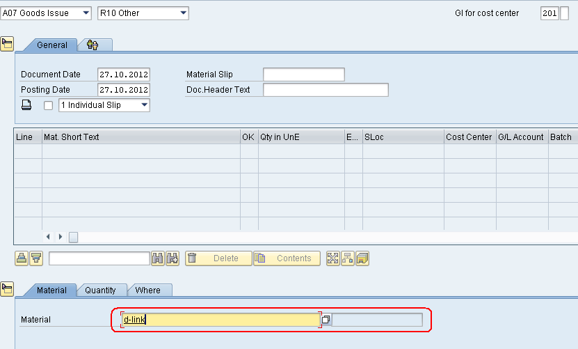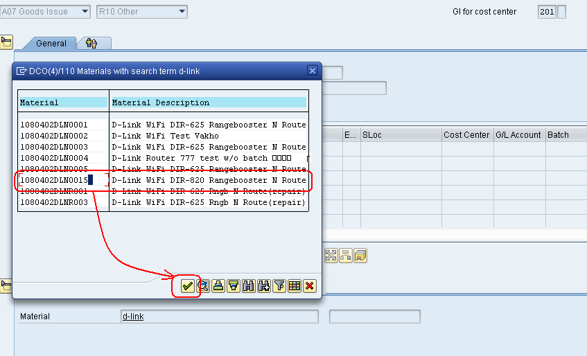 В транзакции MIGO процедура ввода значения в поле «Материал» позволяет вводить (вместо кода) часть краткого текста наименования материала. Система, по нажатию кнопки ввода, попытается автоматически найти код материала, краткий текст наименования которого контекстно совпадает с введёнными данными. Если найден только один соответствующий код материал, то он будет автоматически «подставлен» в поле ввода, а если будет найдено несколько подходящих материалов, то на экране появится диалоговое окно со списком материалов, которые подходят под введённую маску. Например, вводим часть имени (краткого текста наименования) «d-link», Рис.1, затем нажимаем ввод.
