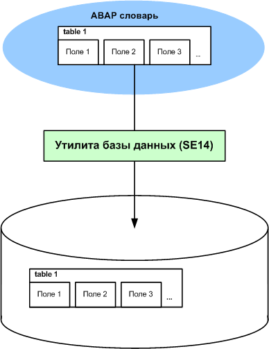 Связь между ABAP словарем и словарем базы данных осуществляется через утилиту базы данных, вызвать которую можно, запустив транзакцию SE14 (Рис. 1).