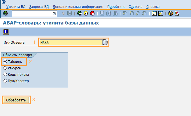 В дальнейшем объект базы данных можно посмотреть с помощью транзакции SE14. В начальном окне транзакции вводим имя объекта (таблицы) и нажимаем кнопку "Обработать" или просто клавишу "Enter" (Рис. 2).