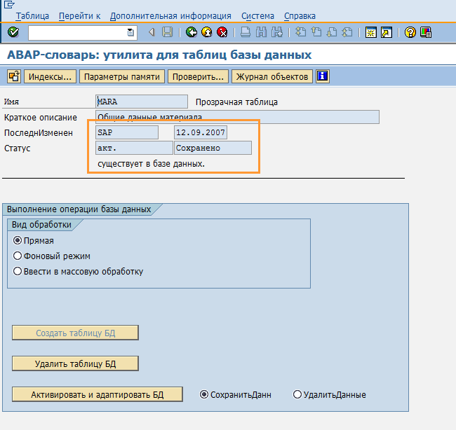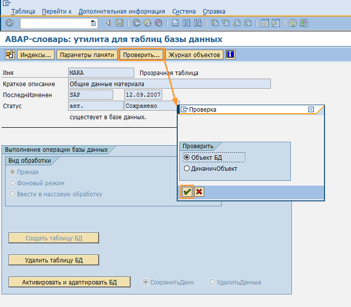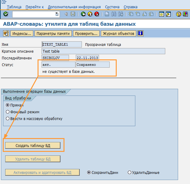 По какой-то причине объект (таблица) может иметь описание в ABAP словаре, но при этом отсутствовать в базе данных. Тогда объект (таблицу) в базе данных можно создать, нажав соответствующую кнопку - "Создать таблицу БД" (Рис. 6).